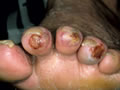 糖尿病が原因で血液の流れが悪くなり、足先・指先まで血液がかよわずに壊疽(えそ)までに発展するのが 『糖尿病性壊疽(えそ) 』 です。 |